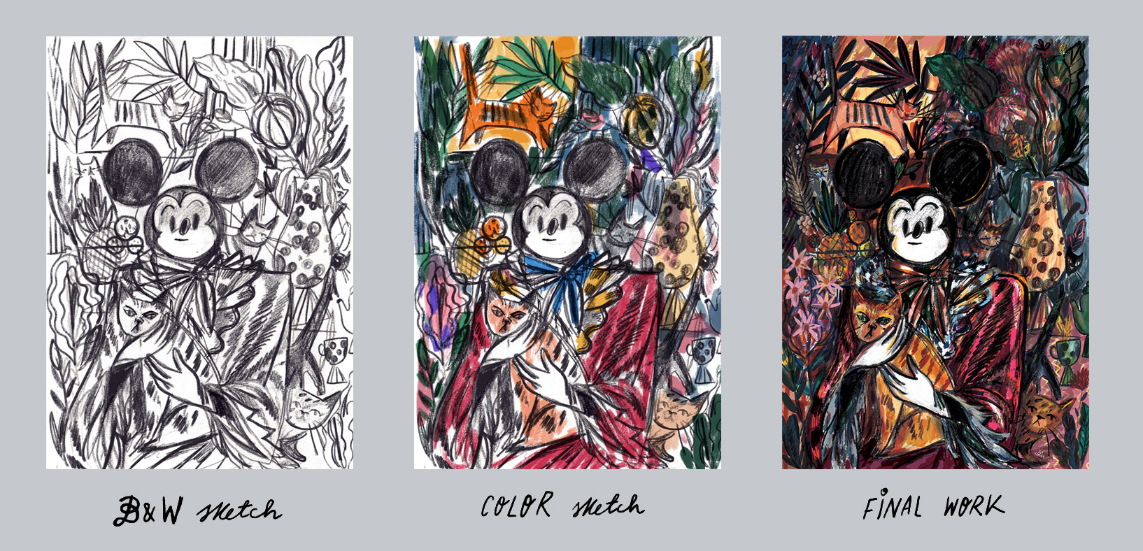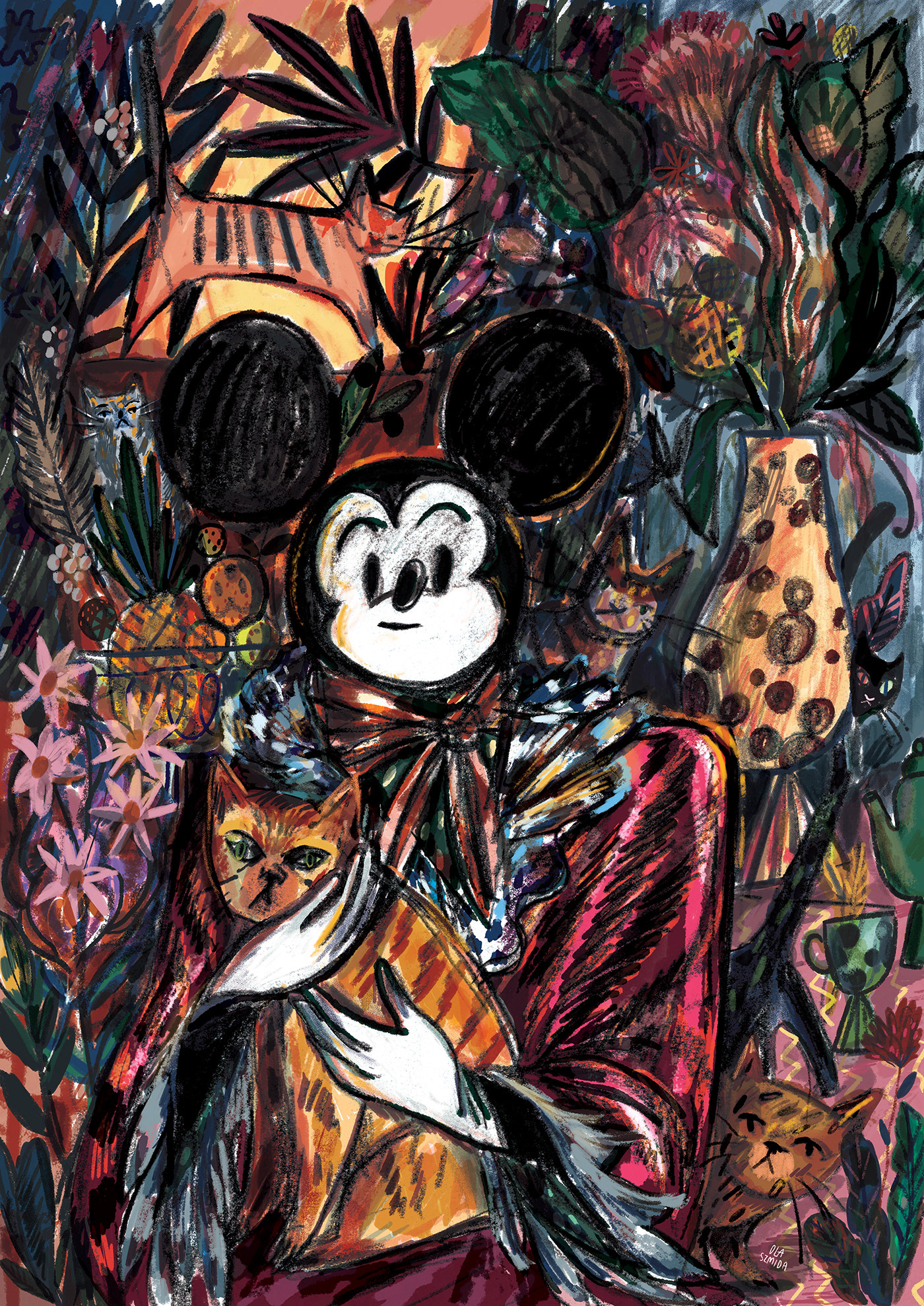 I imagined that Mickey Mouse on his birthday is enjoying a warm afternoon surrounded by his beloved cats and rich exotic flower bouquets