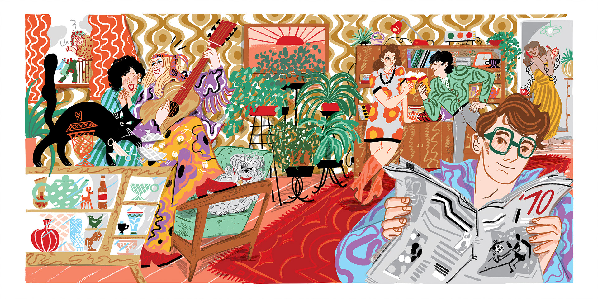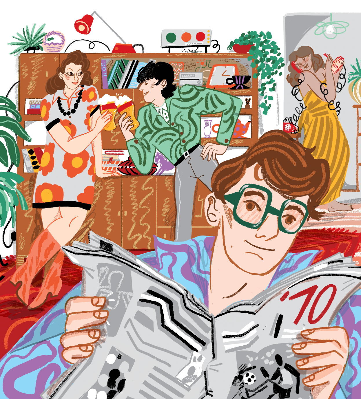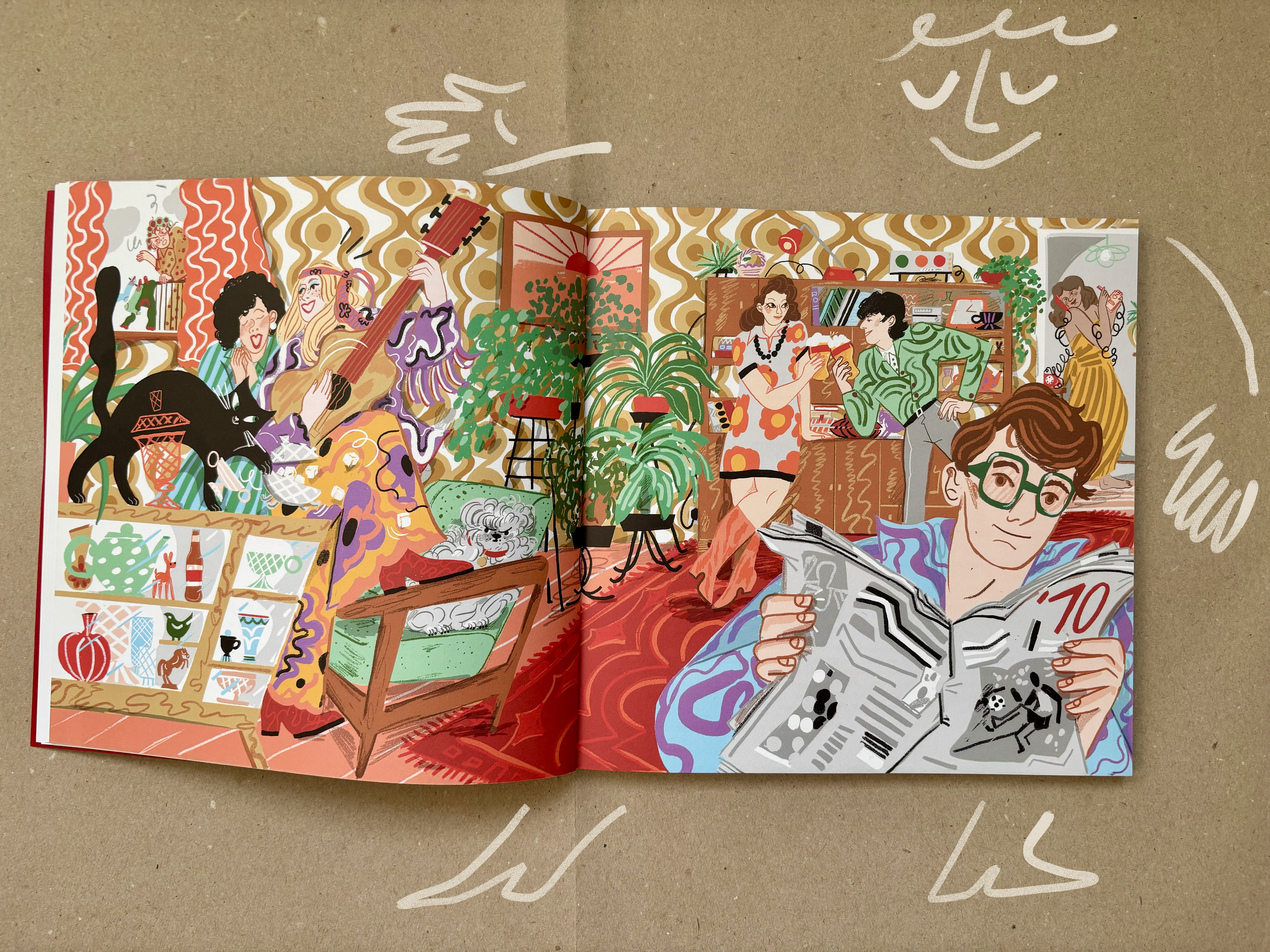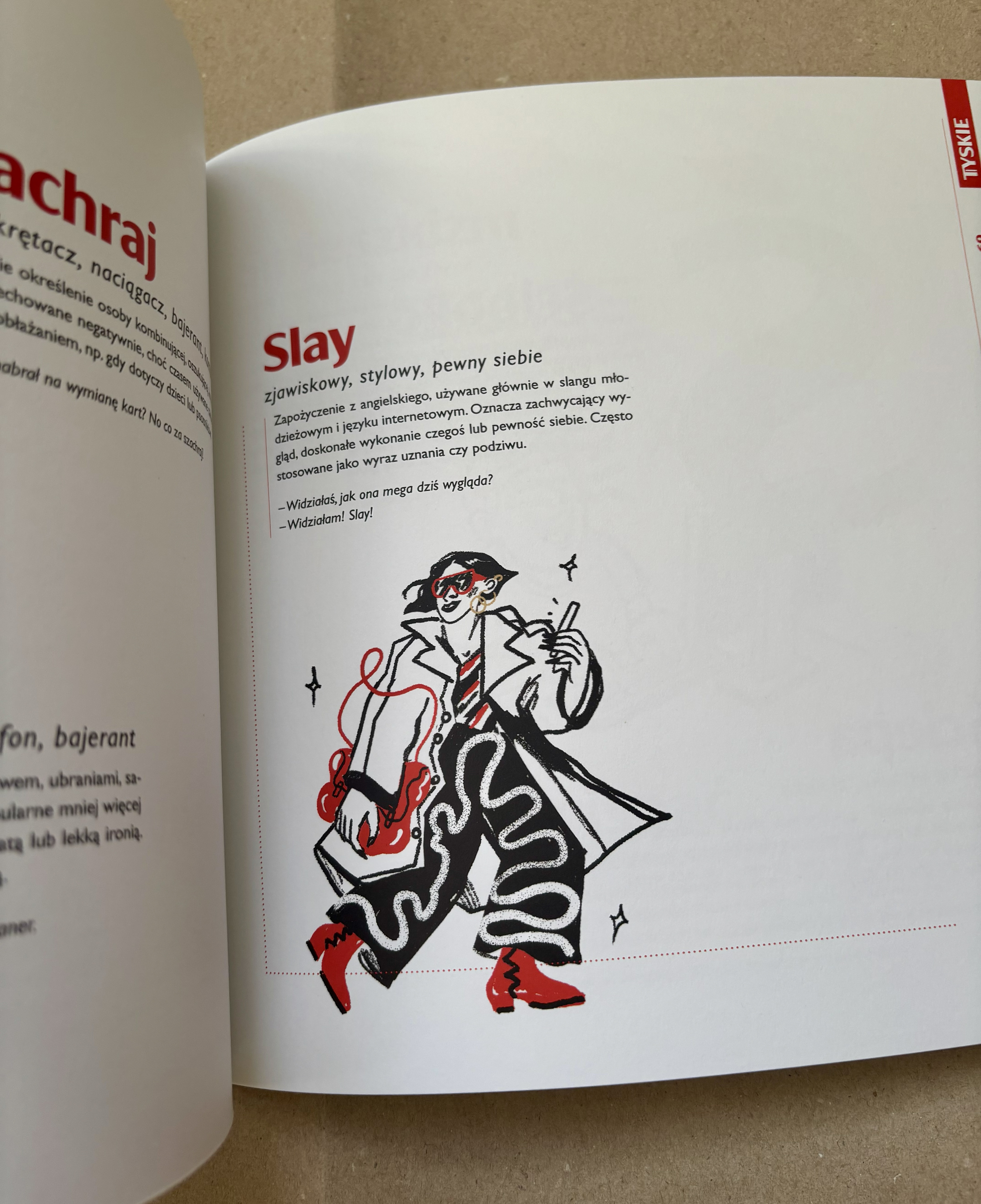The Intergenerational Slang Dictionary is an initiative presenting slang throughout Poland—from the 1970s to 2000. I was asked to create an illustration depicting the 1970s in Poland. I tried to capture the unique design, fashion, and atmosphere of those years by depicting a social gathering in a communist-era apartment. I also created several small illustrations for individual dictionary entries, such as 'slay' and 'dżolo'.