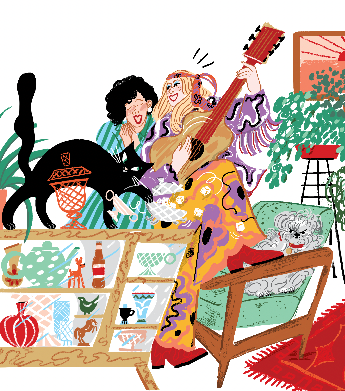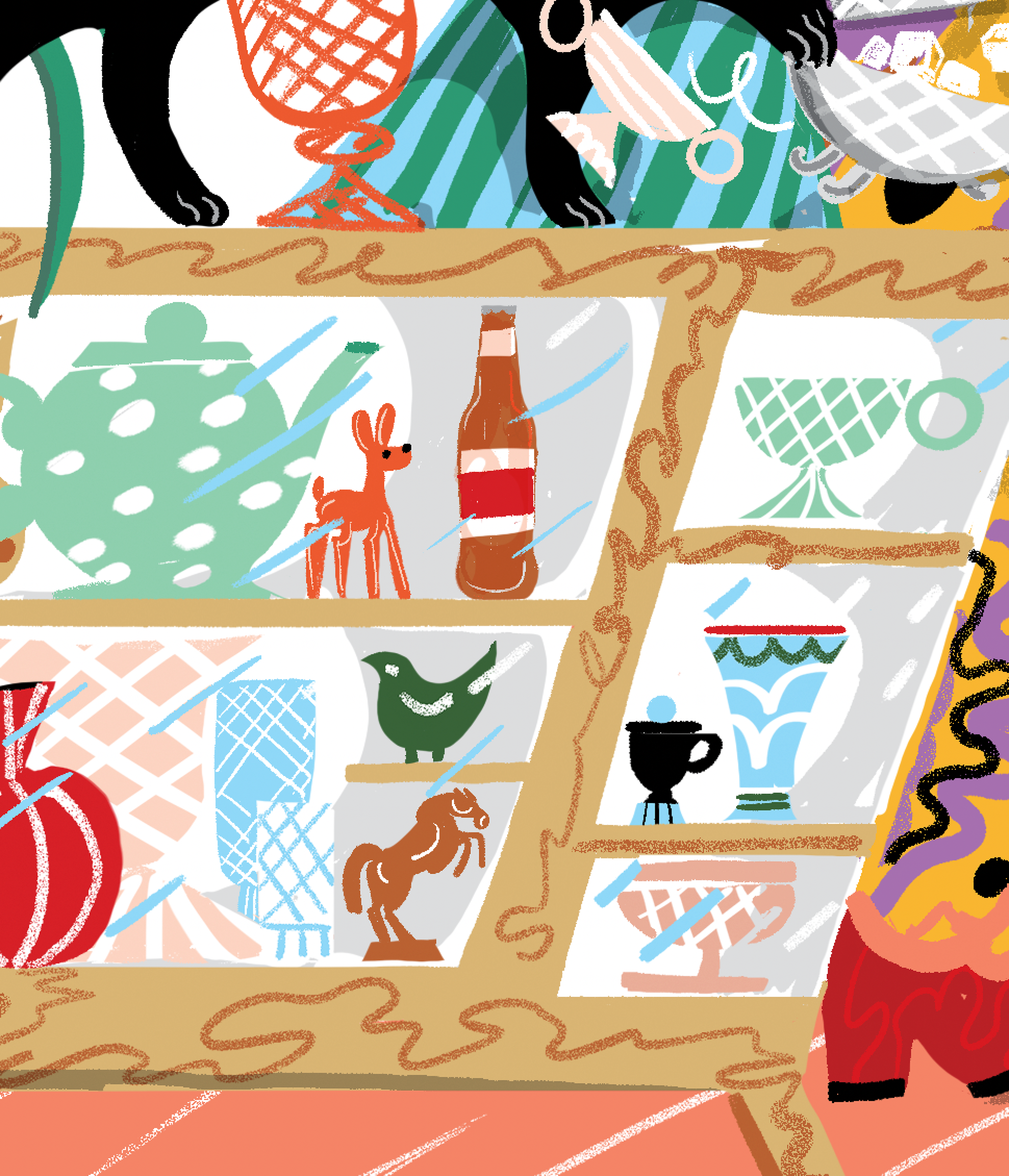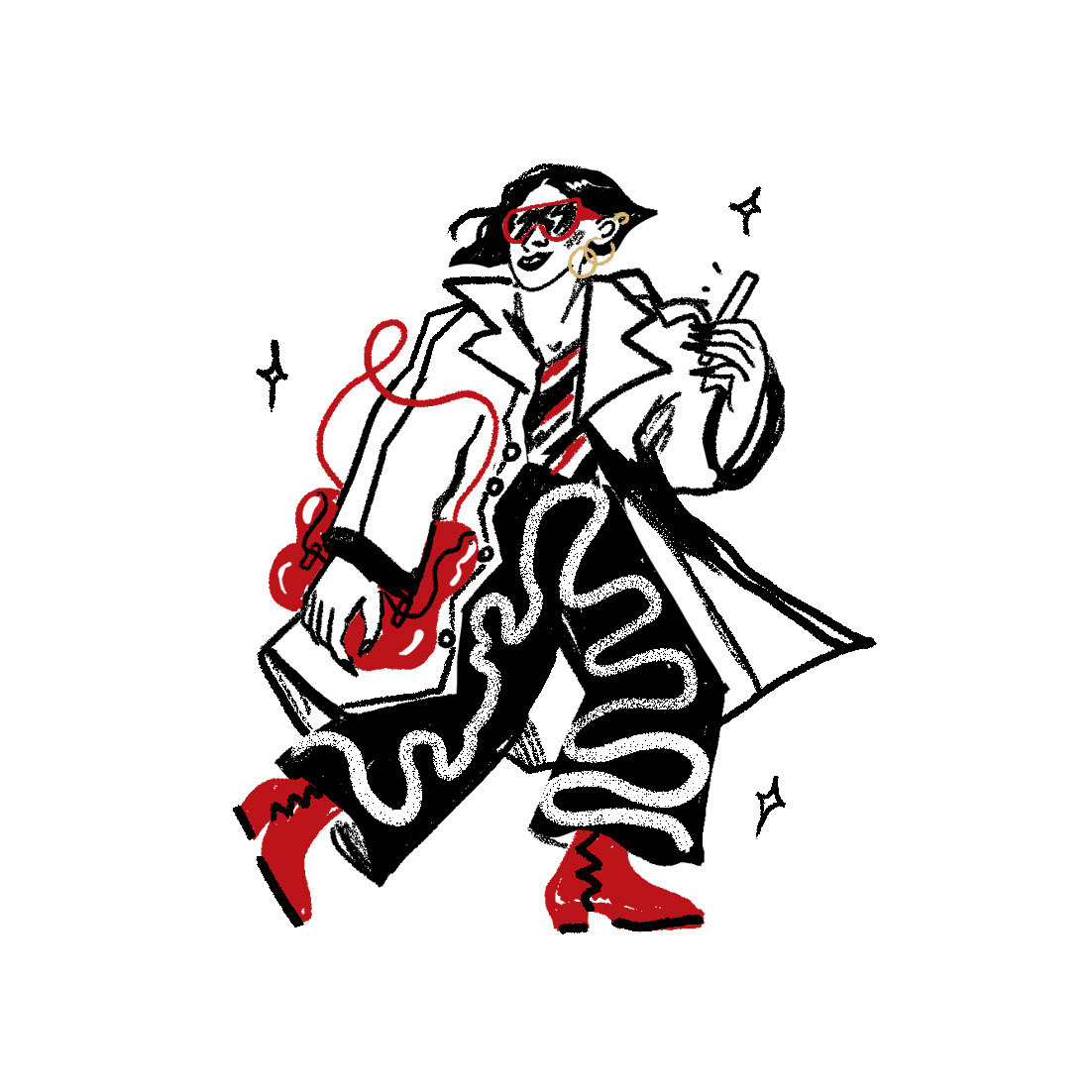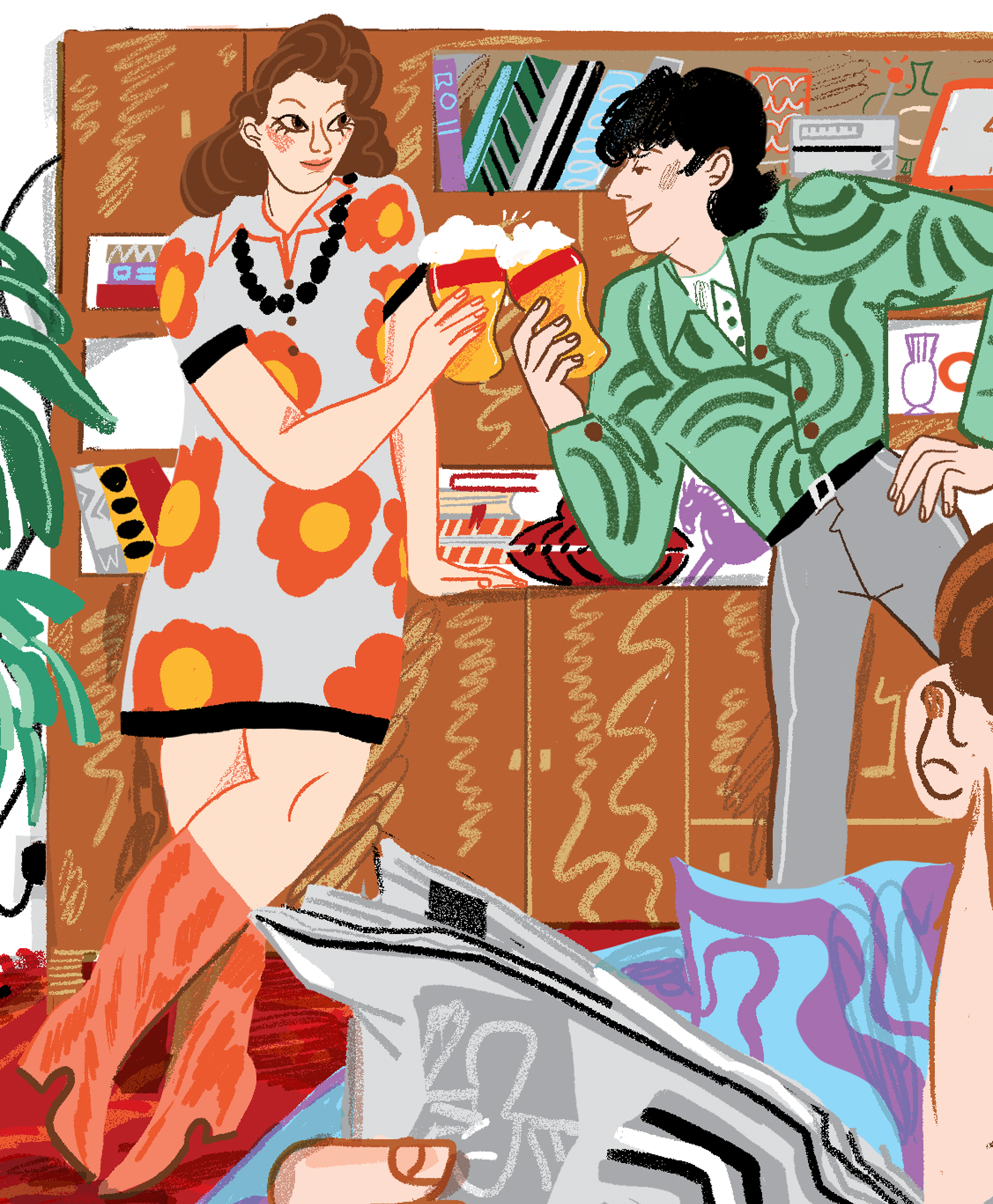 The Intergenerational Slang Dictionary is an initiative presenting slang throughout Poland—from the 1970s to 2000. I was asked to create an illustration depicting the 1970s in Poland. I tried to capture the unique design, fashion, and atmosphere of those years by depicting a social gathering in a communist-era apartment. I also created several small illustrations for individual dictionary entries, such as 'slay' and 'dżolo'.